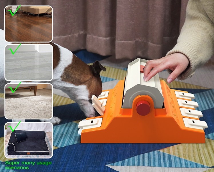 The toy has a rotating food granary which can be removed. This granary can hold about 16.40 ounces of dog food. When the dog rotates the granary with its paws, the food will fall into the 8 food boxes below, and the dog needs to open the cover of the food box with its nose before getting food;