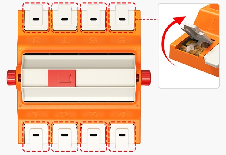 There are 8 food boxes on two sides of the product and each of them has a upper cover. Add food into the food boxes, and the pet will find the correct boxes if they smell the food. By opening the cover of the food box, the pet can get the food;
