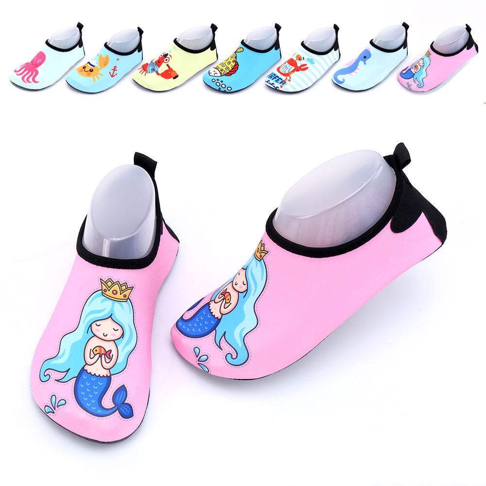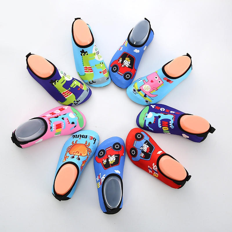 Children's beach shoes use quick-drying mesh/stretch fabric; they must have a rubber toe cap for protection against impacts; some models have a sand-proof lining to reduce sand entry; they avoid sharp decorations and drawstrings (to prevent entanglement/ingestion by young children);