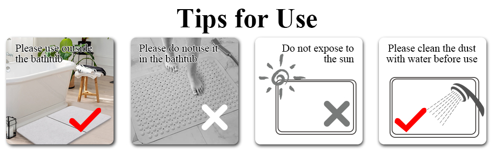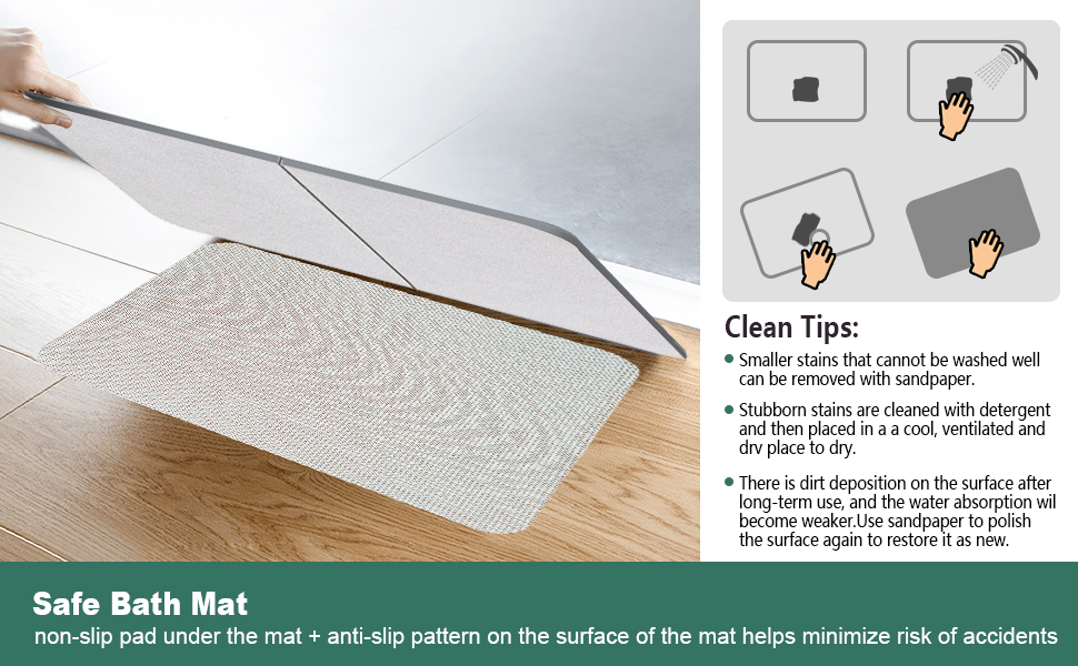 Our diatomaceous earth bath mat is durable and dries instantly keep bathroom floors dry but no daily washing need. If there is a slight stain on the surface, Just rinse with water or wipe with a damp cloth; stubborn stains can be sanded with sandpaper to clean and restored the absorbency. Please do not expose the shower stone bath mat to the sun.