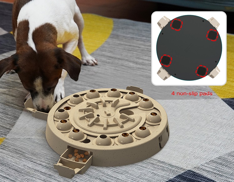 There are 4 drawer granaries around the toy.Dog food or treats can be put into the drawer granaries.The dog can trace the food smell,pull out the granary with paws or snout to get the food.The raw material does not contain any Bisphenol A,PVC and phthalates,completely protecting the health of dogs.it is made of safe and health ABS material,which is strong and durable and will not deform.