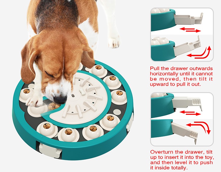 Pull out all 4 drawers from the toy,then turn them over and then push them back into the toy. To insert the fixing pin into the center of the toy to fix the disc so that it cann`t rotate.Then and the dog food into the tower boxex.The dog needs to put the tower box to cover the round food bin in turn,and then push the tower box back to eat the food in the round bin.