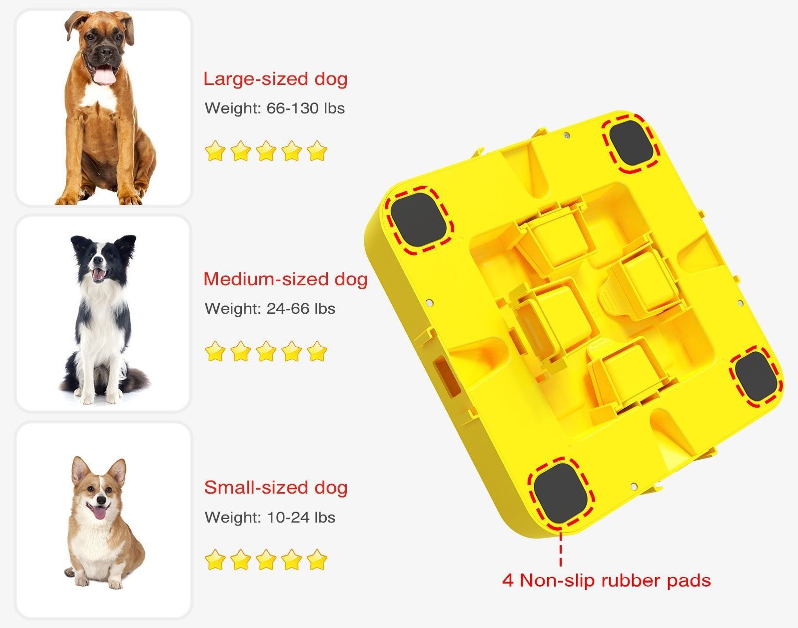 Dog puzzle toy also doubles as a slow feeder, helping your pet eat at a healthier pace. By slowing down eating, it reduces the risk of bloating and promotes better digestion. Equipped with four non-slip rubber pads, it ensures stability and prevents tipping during use. Suitable for a variety of surfaces, including wood, tile, and carpet, this durable toy is easy to clean and is a must-have for any dog owner focused on their pet’s well-being.