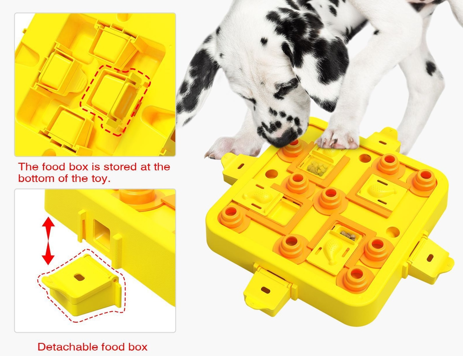 Experience the ultimate puzzle challenge with unique design that combines three distinct difficulty levels in one toy. With four sliding compartments, nine movable boxes, and four removable flip-lid compartments, your dog will enjoy endless playful while solving the puzzle to retrieve treats. Customize the challenge to suit your dog’s needs, making it an ideal solution for intellectual stimulation and mental growth.