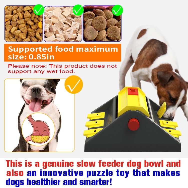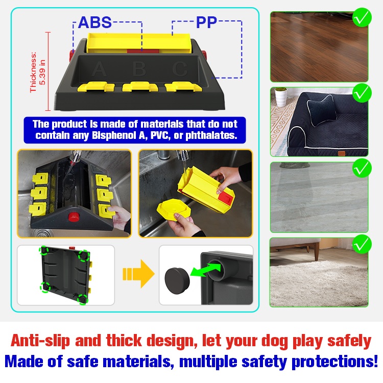 This puzzle toy can improve pets' intelligence and promote their development, and the gameplay from difficulty level 1 to level 2 is integrated into one toy. It is also a training toy that can make your dog's mood and character more stable. It is also a slow feed tableware for pets.The product is made of food-grade ABS without any Bisphenol A, PVC and Phthalates, which completely protects your dog's health, so you can let your dog use it without concern. The toy is very strong and durable, resistant to bite and scratch and will not deform;