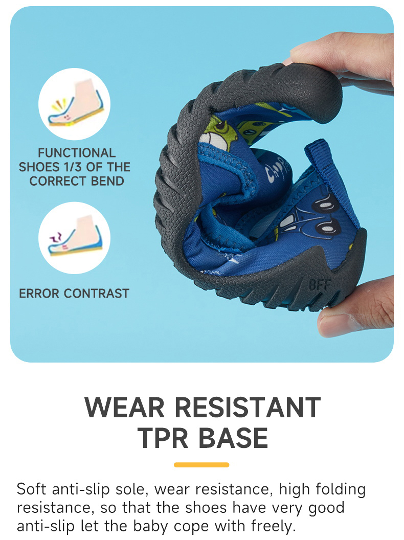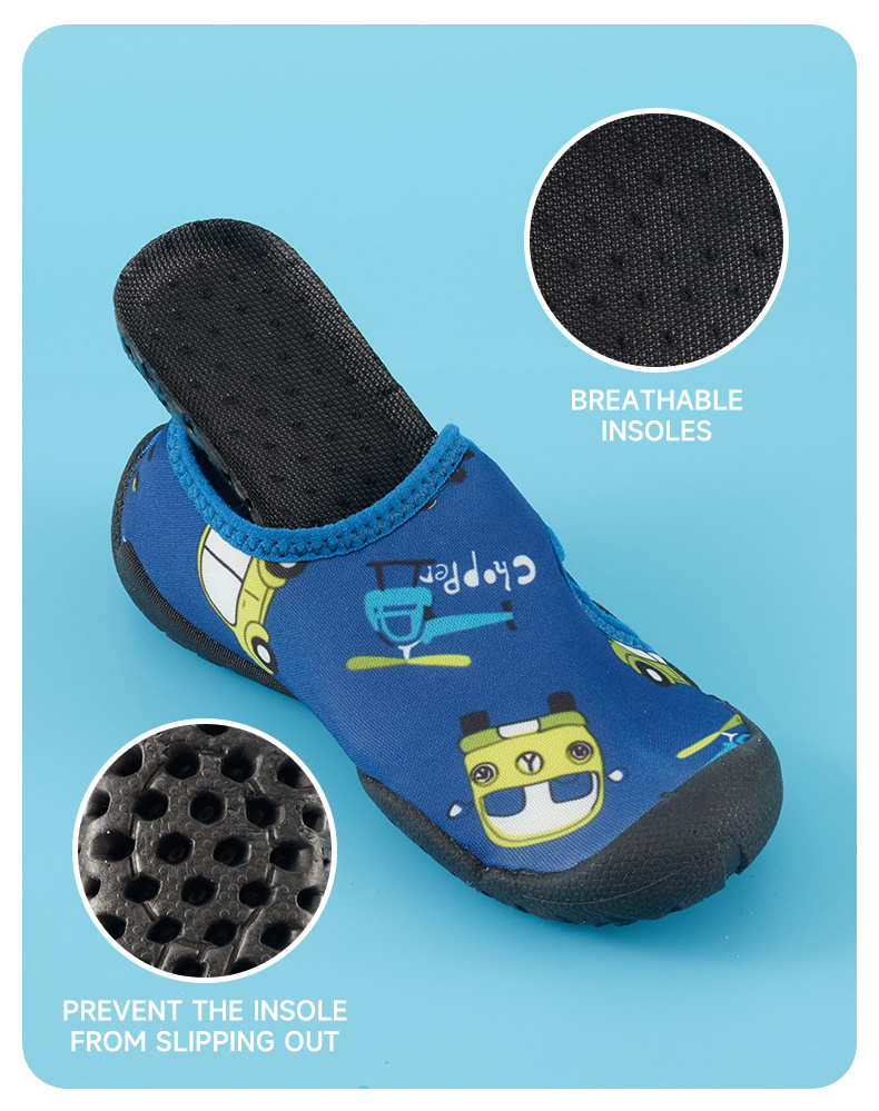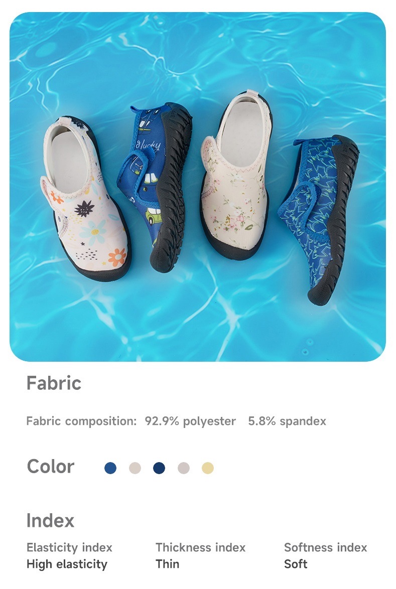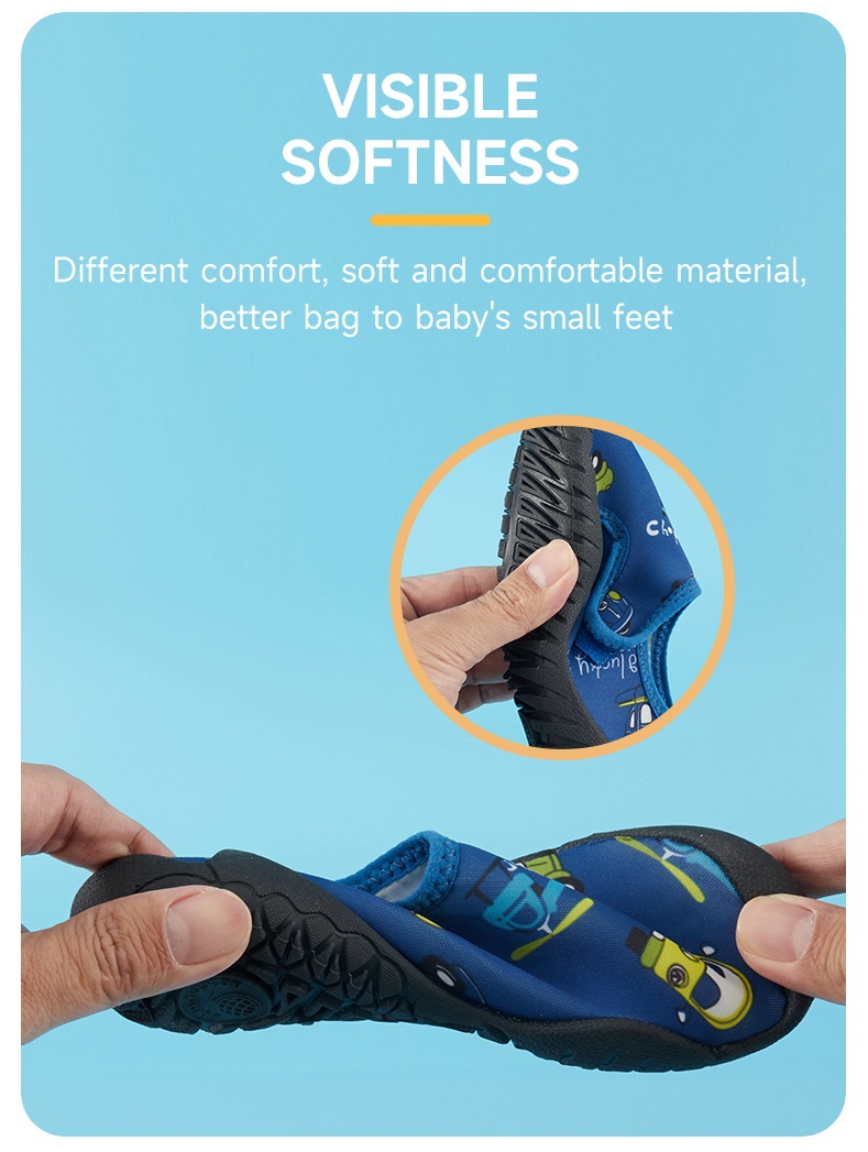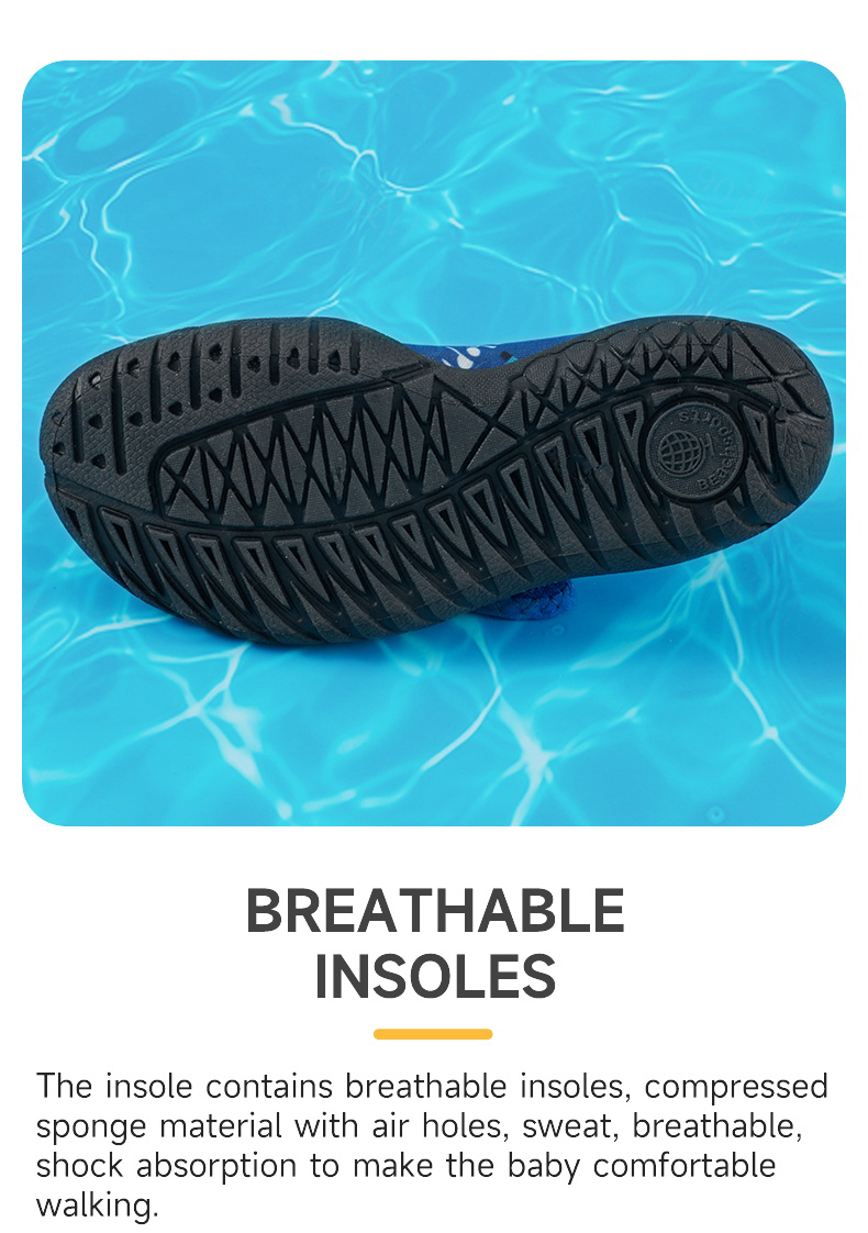 Children's water shoes use breathable mesh/elastic fabric, balancing quick-drying and sand/gravel protection; reinforced rubber toe caps provide protection against kicks and impacts; some models have anti-sand lining to reduce sand irritation;