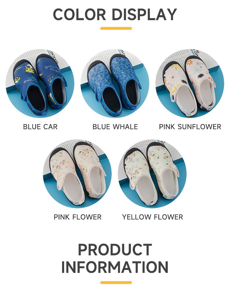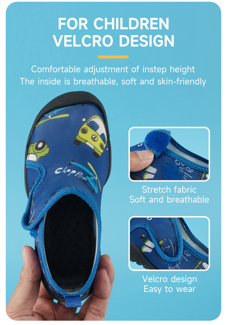 Children's water shoes are designed specifically for children and are suitable for wading/wet environments. Unlike ordinary rain boots or sandals, they prioritize quick-drying and drainage, wet-surface slip resistance, and protection against punctures and impacts. They are also lightweight and easy to put on and take off, protecting children's feet from being scratched by rocks and shells and preventing slips on mossy surfaces or in shallow water. After use, they dry quickly, reducing sweat and odor.