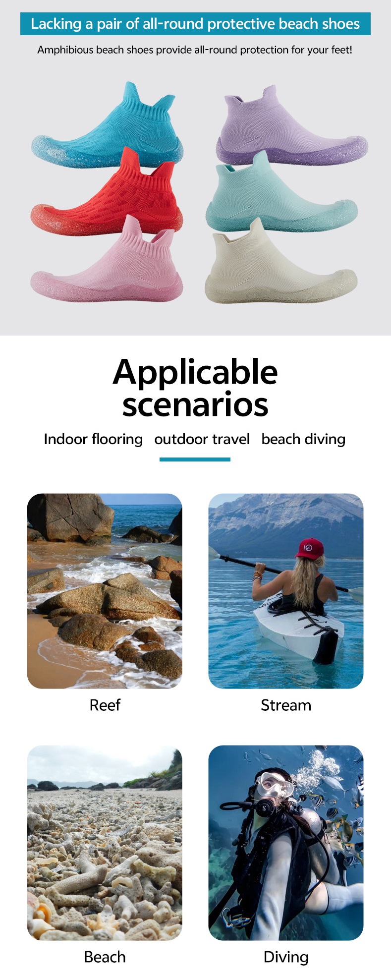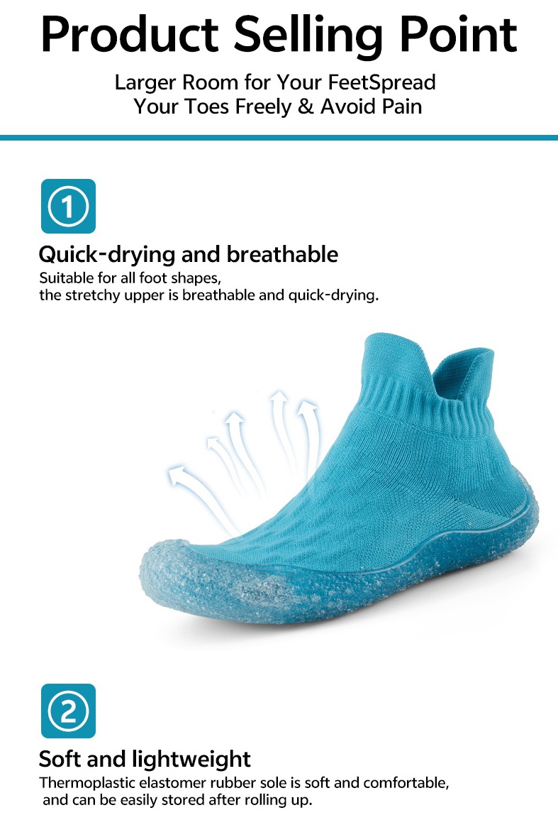 The design of water shoes revolves around four core principles: quick water entry, quick drainage, stable slip resistance, and lightweight protection. They are functional water shoes specifically designed for all-terrain use in both water and on land, with all structures adapted for both water and land environments.