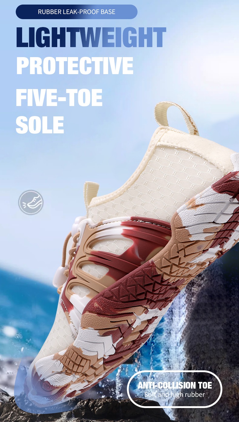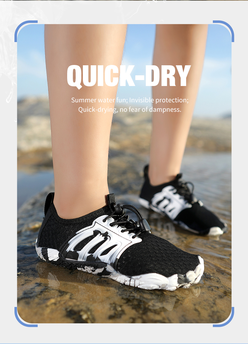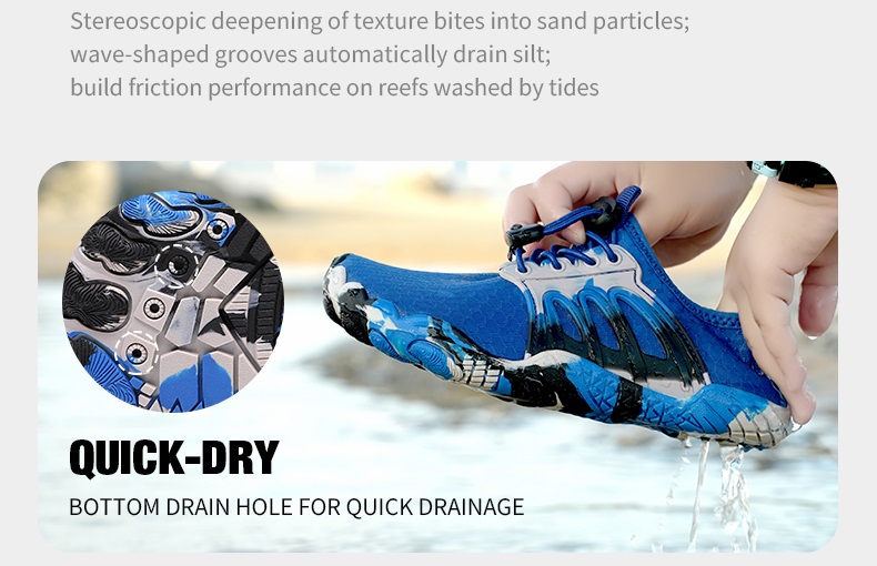 The anti-slip design provides significantly better wet-surface traction than regular athletic shoes, reducing the risk of slipping on wet rocks and docks; quick-drying fabrics and structural designs accelerate water drainage, and most insoles/linings are treated with antibacterial agents to reduce odor; the wrap-around design protects against scratches from shells, pebbles, and seaweed, and the reinforced toe protects the toes.