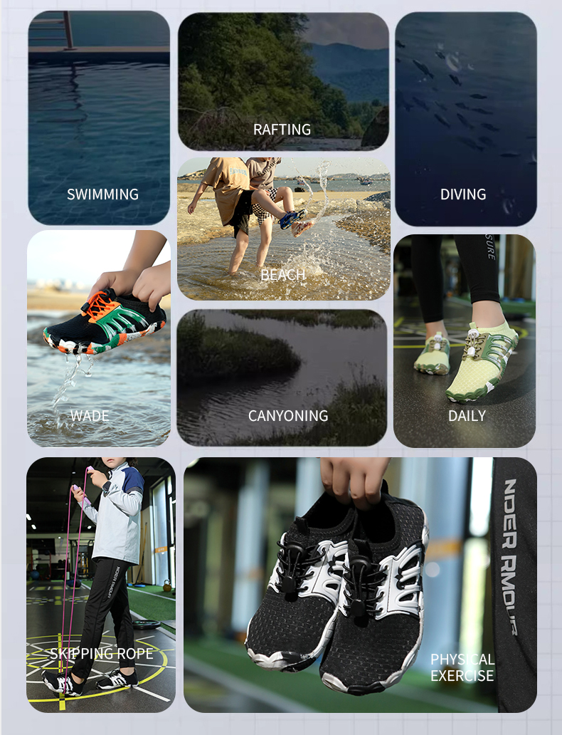 Outdoor applications: stream trekking, river hiking, fishing, kayaking/paddleboarding; beach walks, snorkeling, and exploring tide pools; commuting on flooded city streets, avoiding wet feet with regular shoes; children's models prioritize safety and convenience, suitable for swimming pools and water parks.